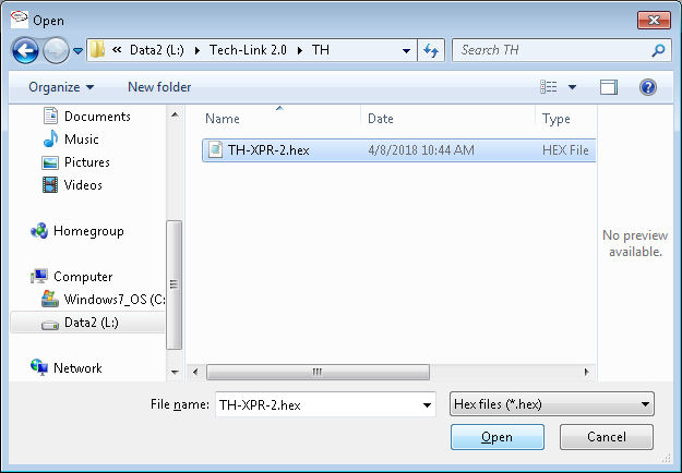 TH-XPR-2.hex is selected. Click Open, wait until the "Programming